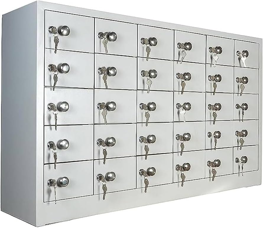 Each compartment features an individual lockable door, proper ventilation slots, and smooth edges for safe handling. The compact design saves floor space while offering maximum security for small personal items such as mobile phones, ID cards, keys, wallets, and smart devices.